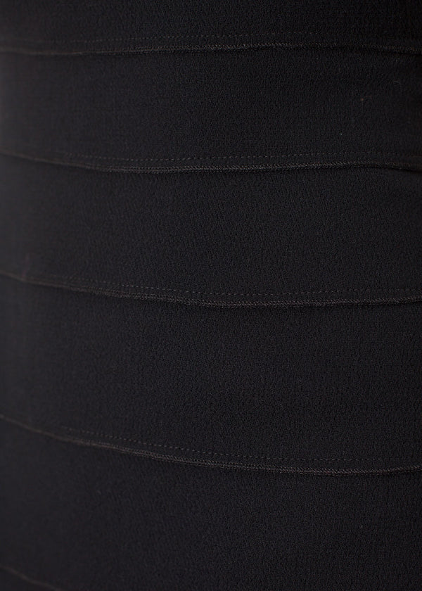 Hand crafted from concept to finished product, the Columbian label Amelia Toro is authentically kind and creative. Sleeveless dress with asymmetrical collar takes a traditional piece unforgettable. Interesting banded fabrication on front, long paneling in back. Back zip closure. Color Black. 100% Crepe Wool. Made in Columbia. Lana is wearing a Size 2.