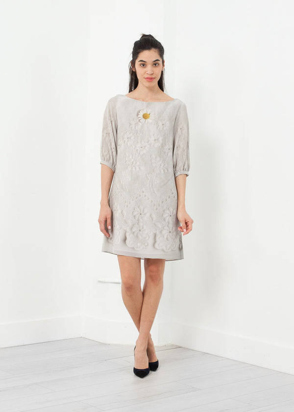 The designs of Antoni & Alison are a melange of trompe l'oeil digital imagery printed on fine silks, rendering a specified aesthetic that defines the brand and culls a dedicated clientele. The Daisy delights with its subtle textural printing and details. Flowing peasant sleeves. Wide boat neckline. Lining. Color Grey. 100% Silk. Made in the U.K. Ashley is wearing a Size 8.
